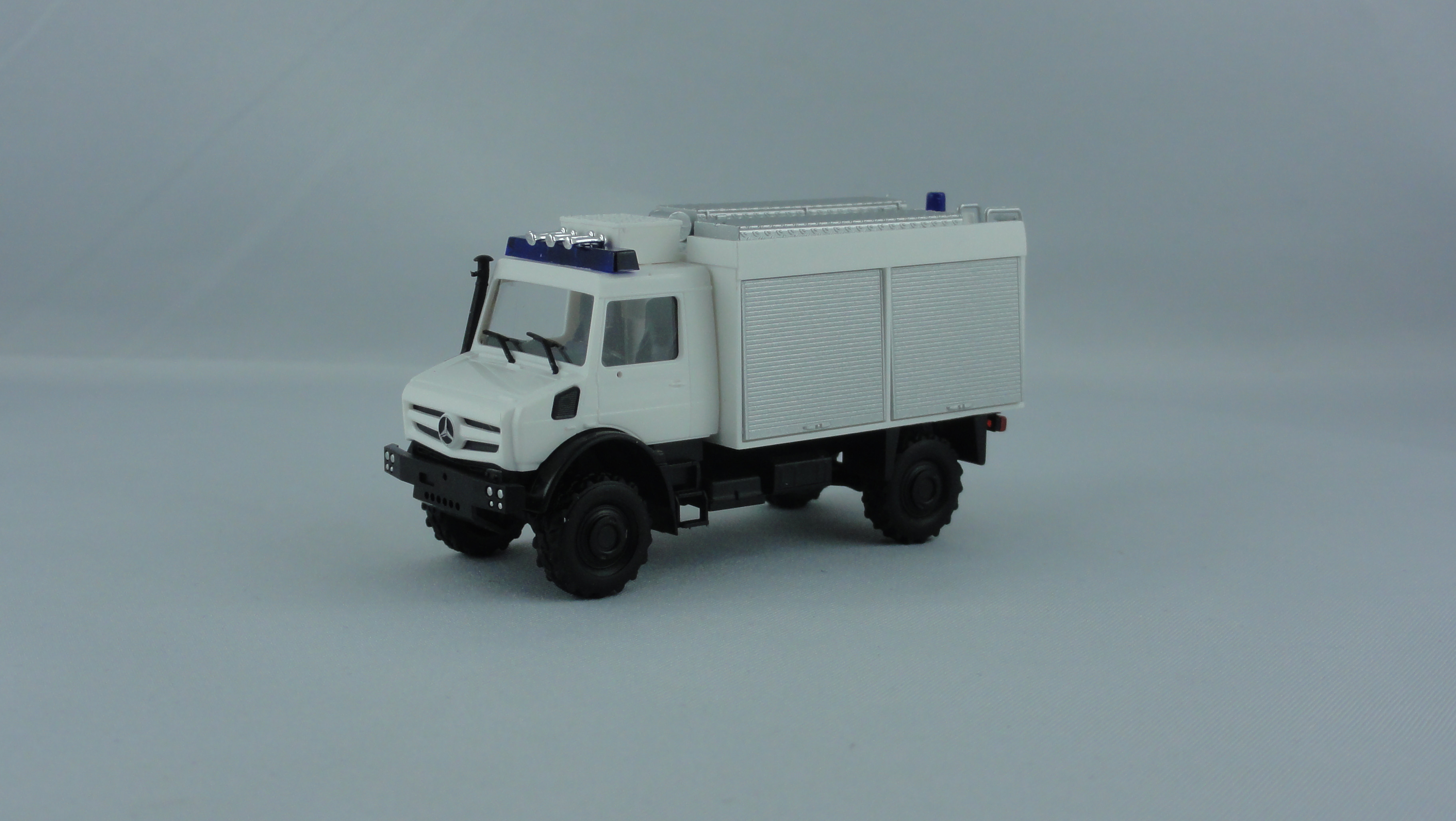Busch MB Unimog U 5023 TLF in weiß ohne Drucke mit zusätzlichem Kasten auf dem Fahrerhaus, Blaulichtbalken und Hörner,. Das Grundmodell ist in weiß und hat keine weiteren Bedruckungen.